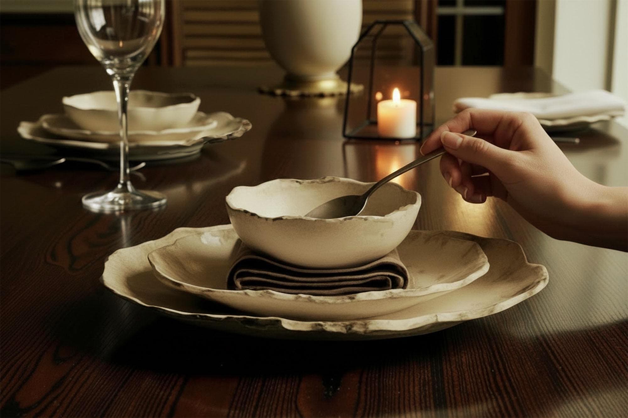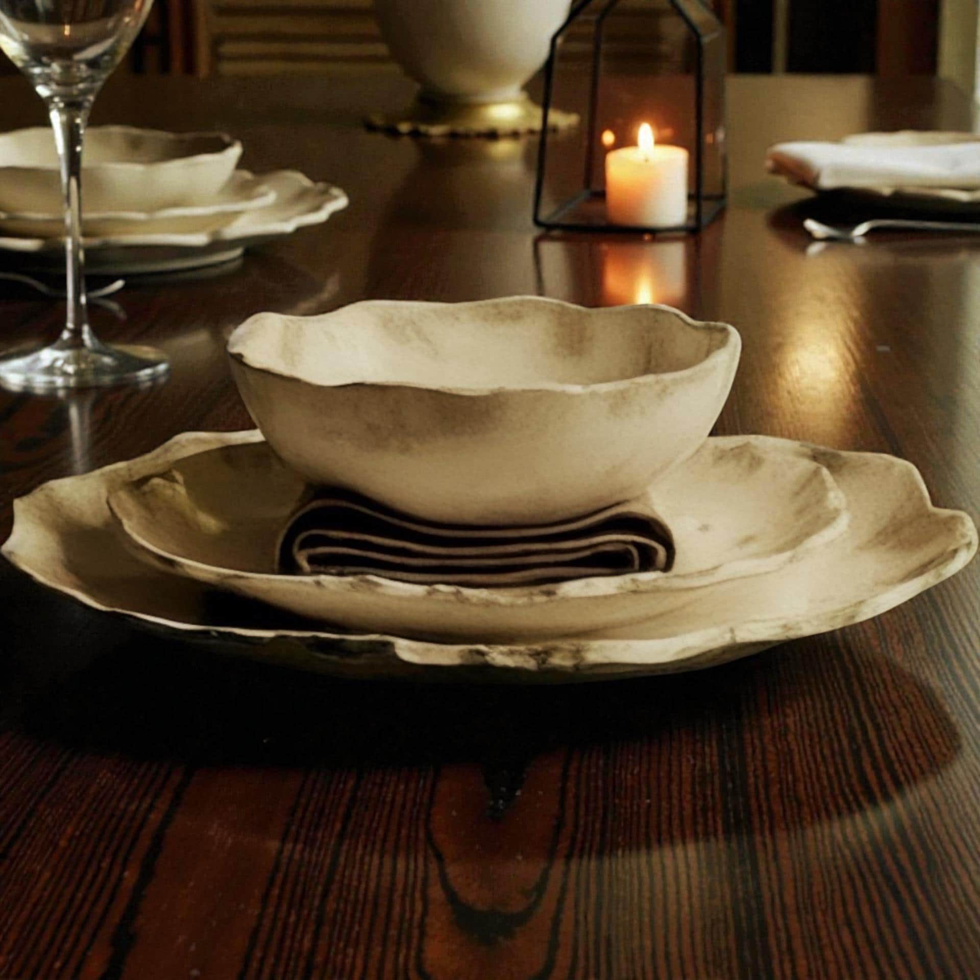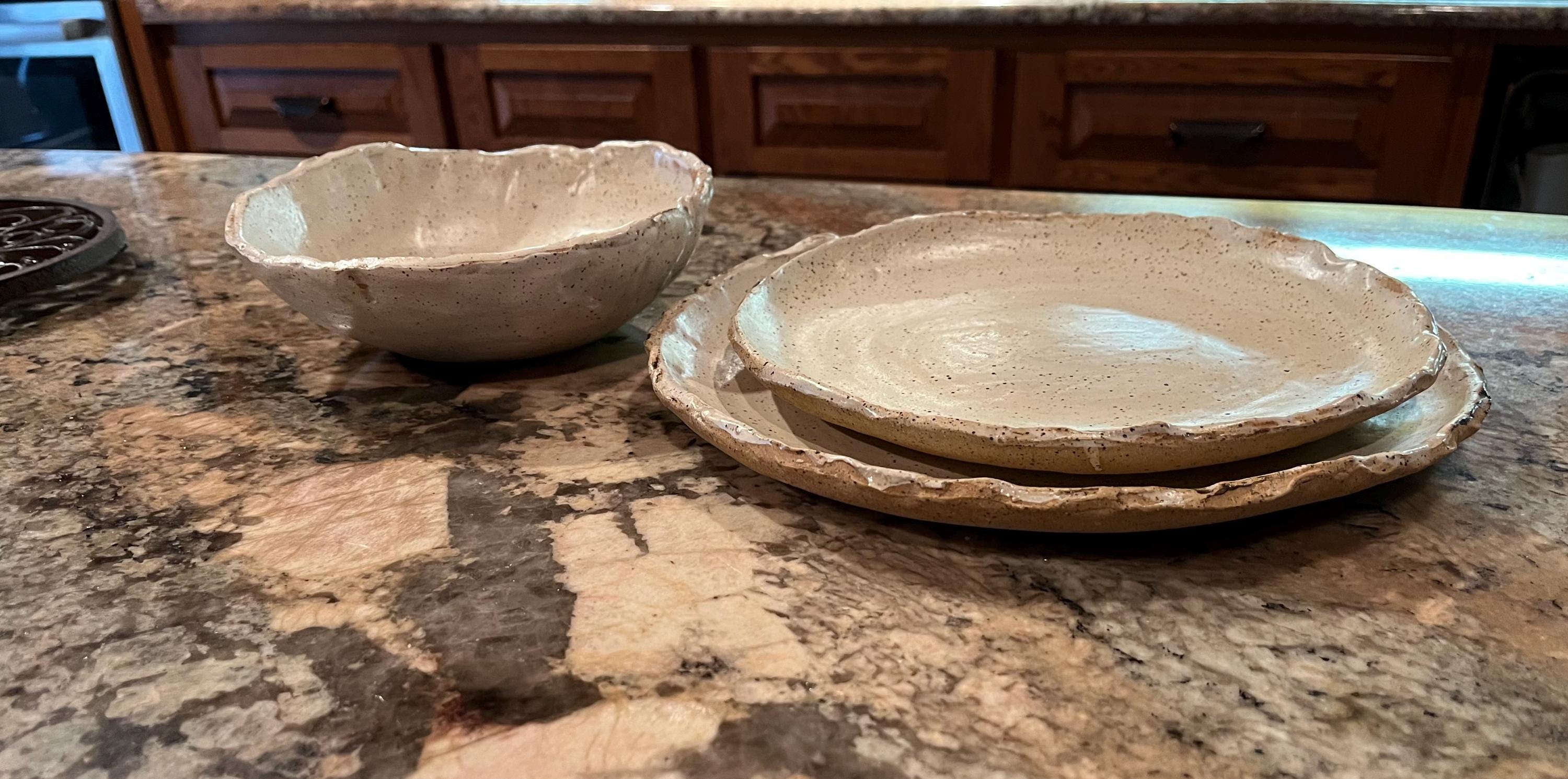 Your entire 12 pieces will each be hand rolled, hand formed and custom glazed. Your dinnerware will be one-of-a-kind and sizes, shapes, and colors may vary slightly, but each piece is its own story. I have tried to add photos depicting the variations and nuances of the set. Each set is unique and special! The glaze color is cream with darker espresso accents on the rims and edges