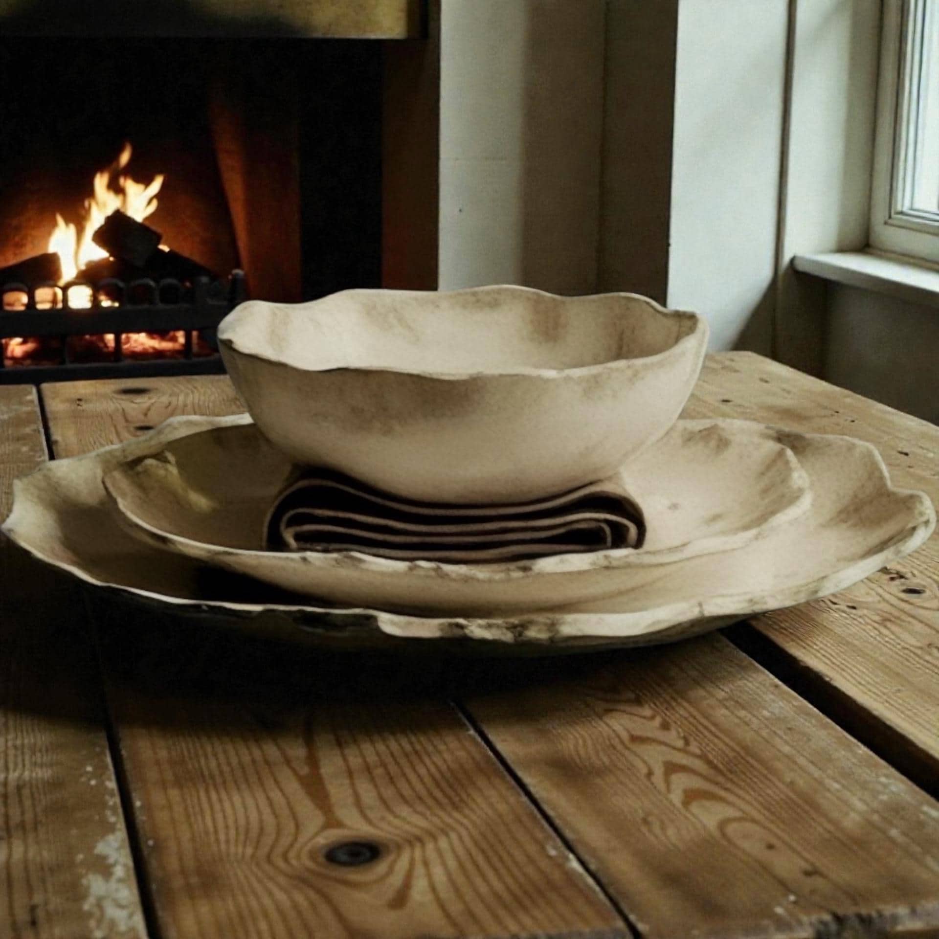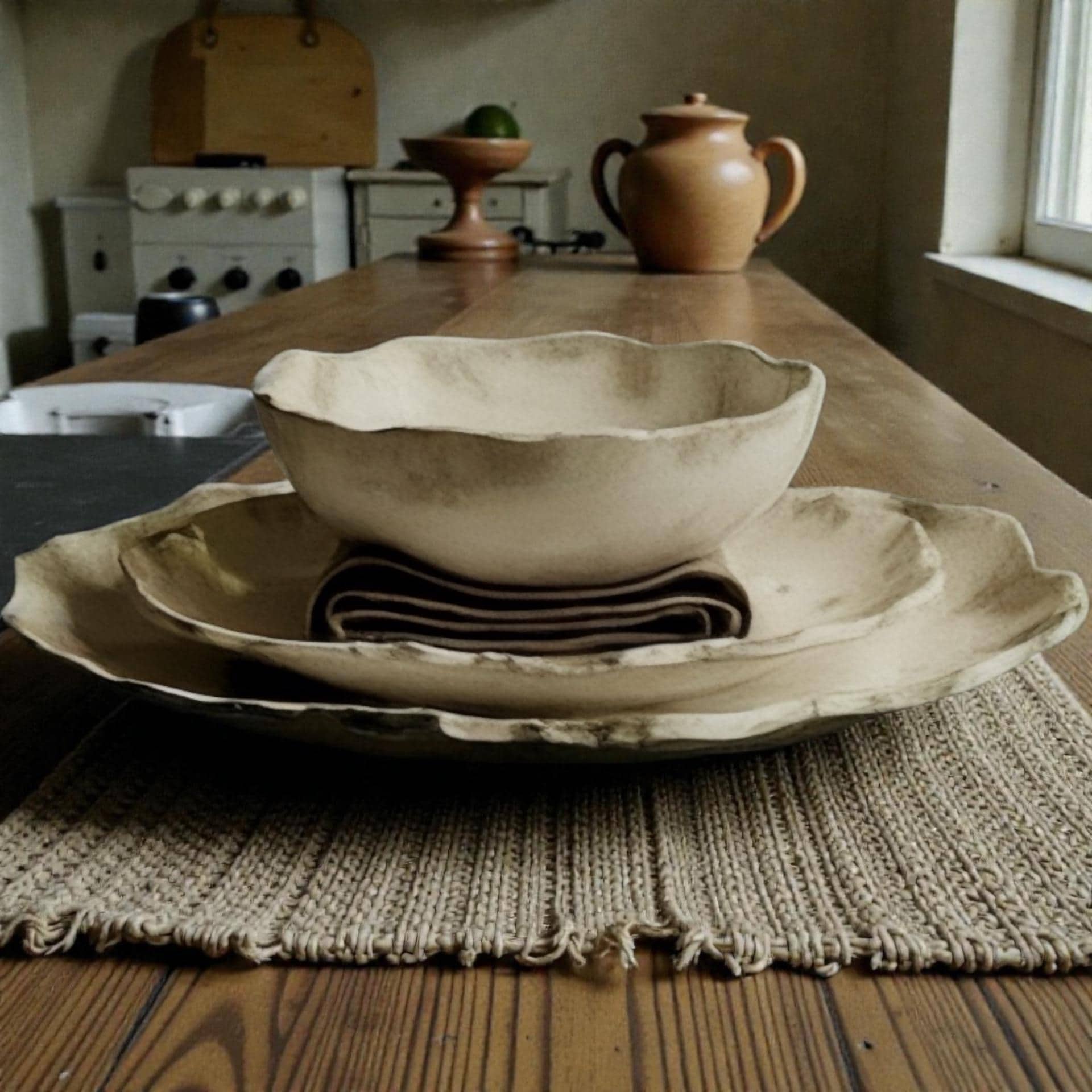 Beautifully rustic edge with natural buff stoneware unglazed bottoms.