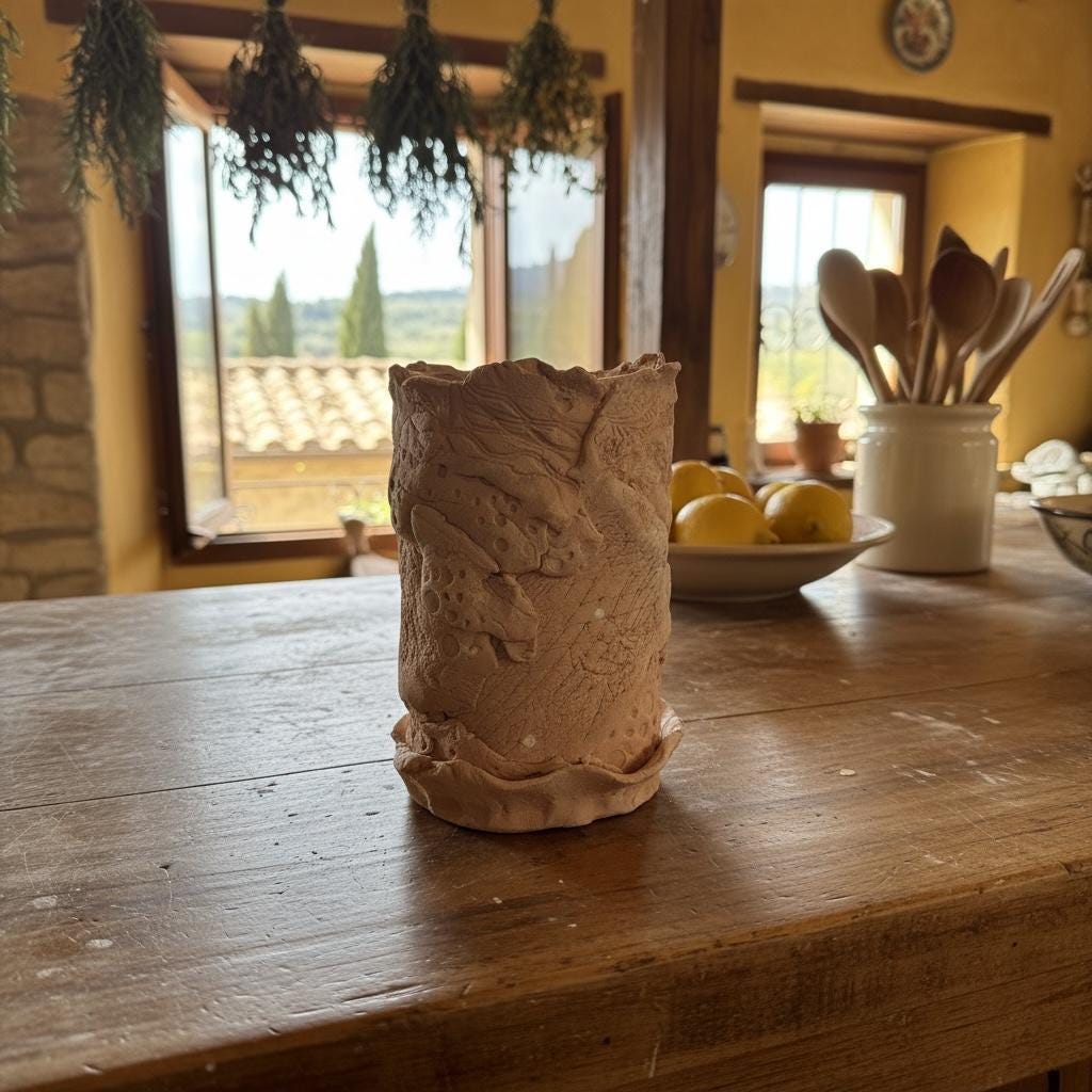 The interior is glazed in creamy, sand glaze, and the exterior is unglazed to highlight the textures and movements of the clay. It is high fired and fully vitrified.