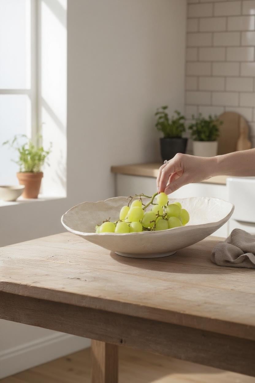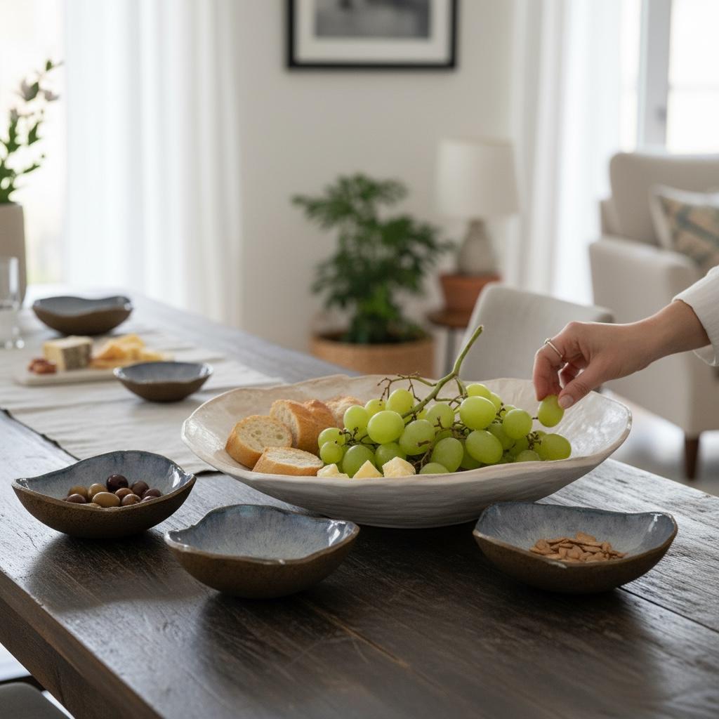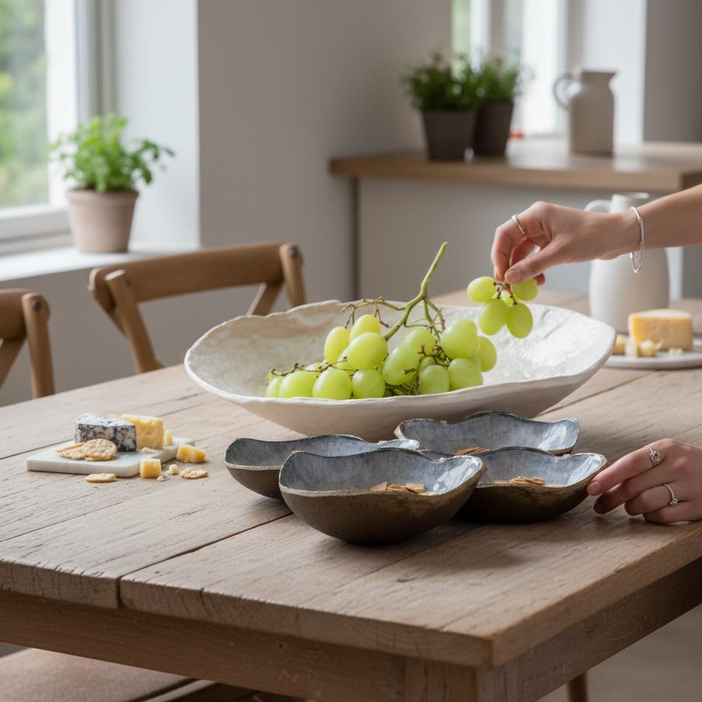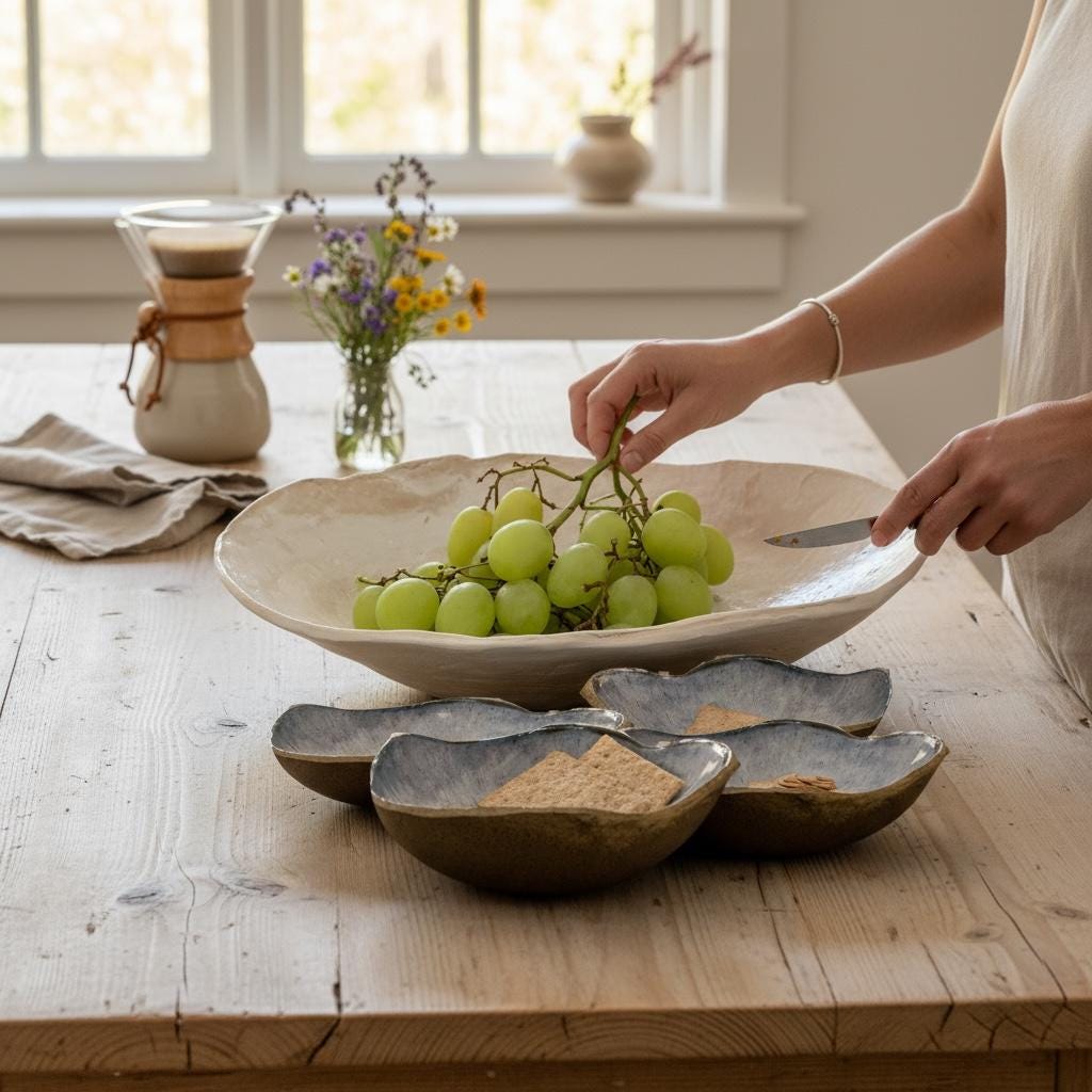 Handmade irregular organic shapes, rustic with natural stoneware unglazed bottoms.