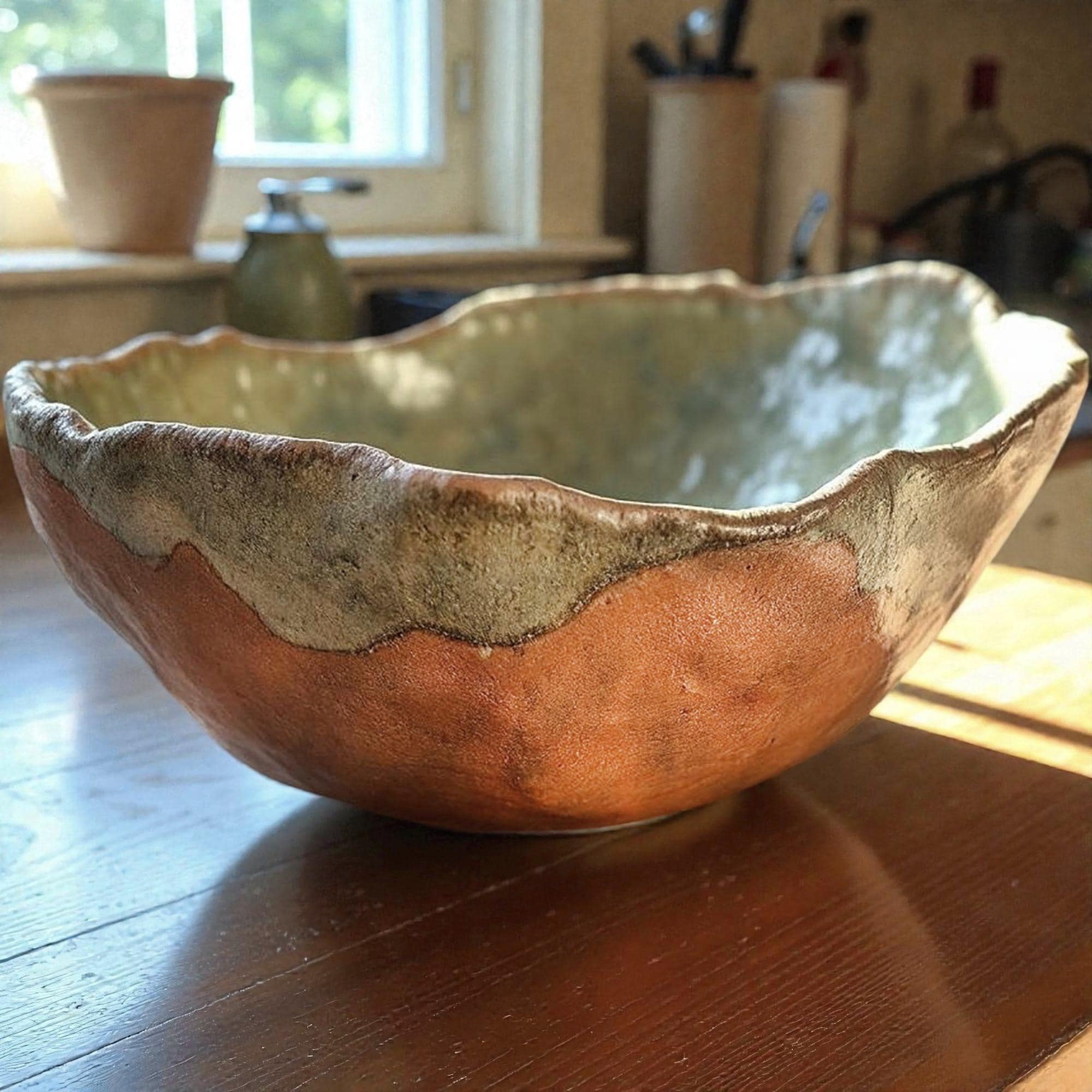 Rustic Pottery Serving Bowl, 11-13 in, 4-4.5 inches tall, Hand formed, custom glaze, farmhouse table, rustic tableware