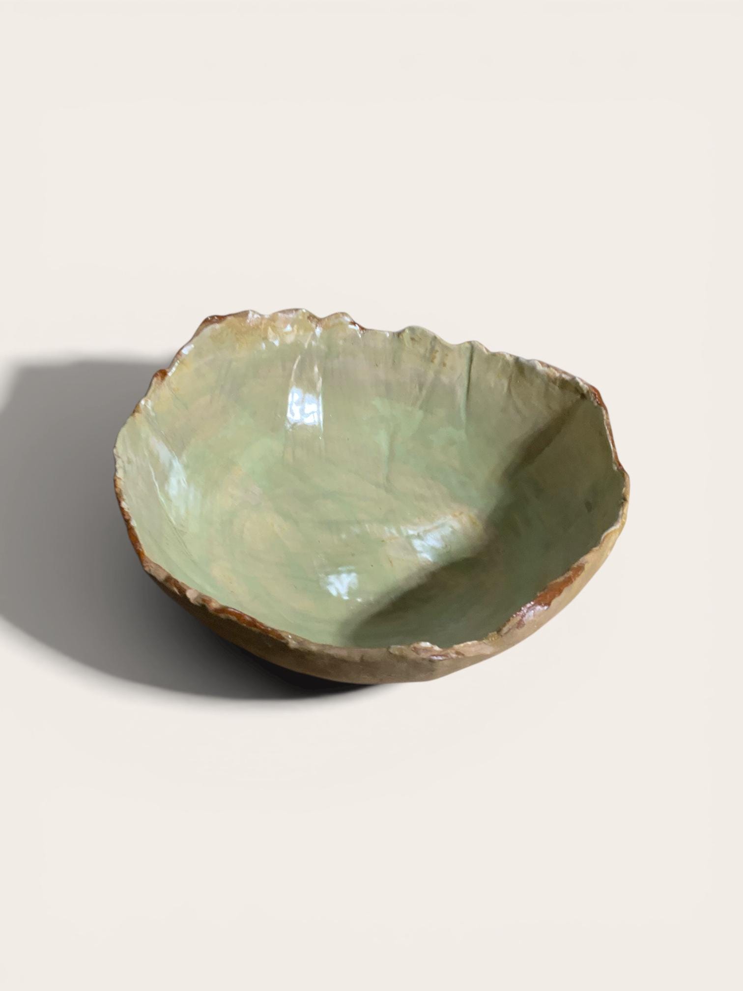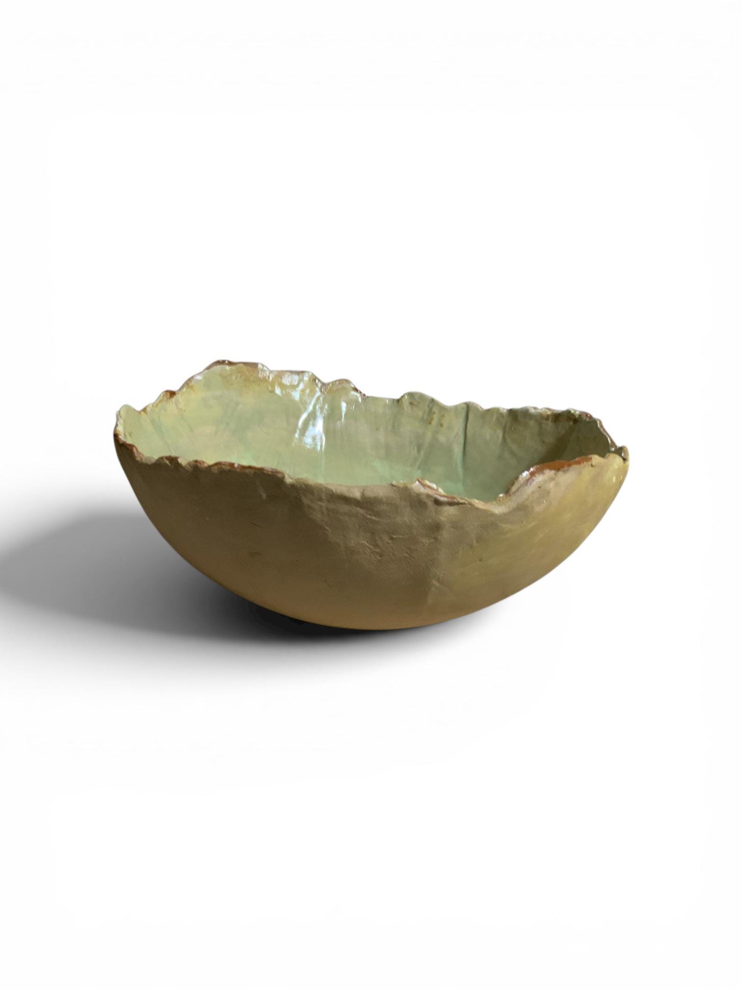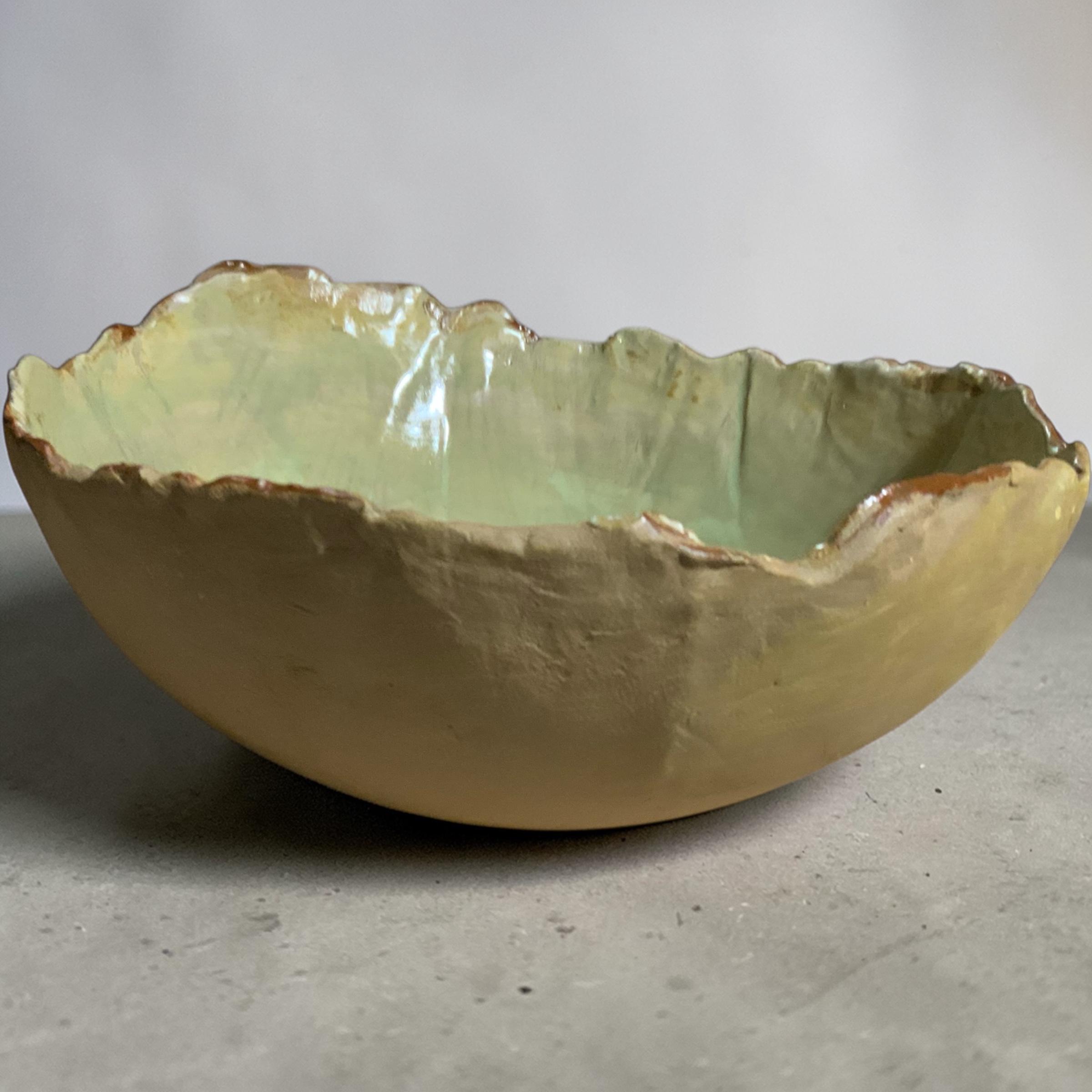 One-of-a-kind custom interior glaze, natural unglazed exterior, which can be various shades of chocolate, slate, or buff.